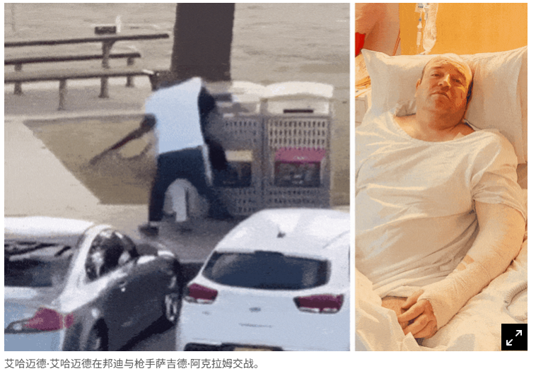 在数百万人观看的画面中,艾哈迈德在下午6点45分从两辆停着的车之间跳出,抓住了枪手。 “情感上我正在做些什么……我感觉到身体和大脑中有某种力量,我不想看到有人在我面前被杀,不想看到鲜血,不想听到他的枪声,不想看到人们尖叫、呼求“救命”。 他说“那是我的灵魂要求我去做的,我内心、大脑、一切的一切都在运作,你知道,去管理和拯救人民的生命”。